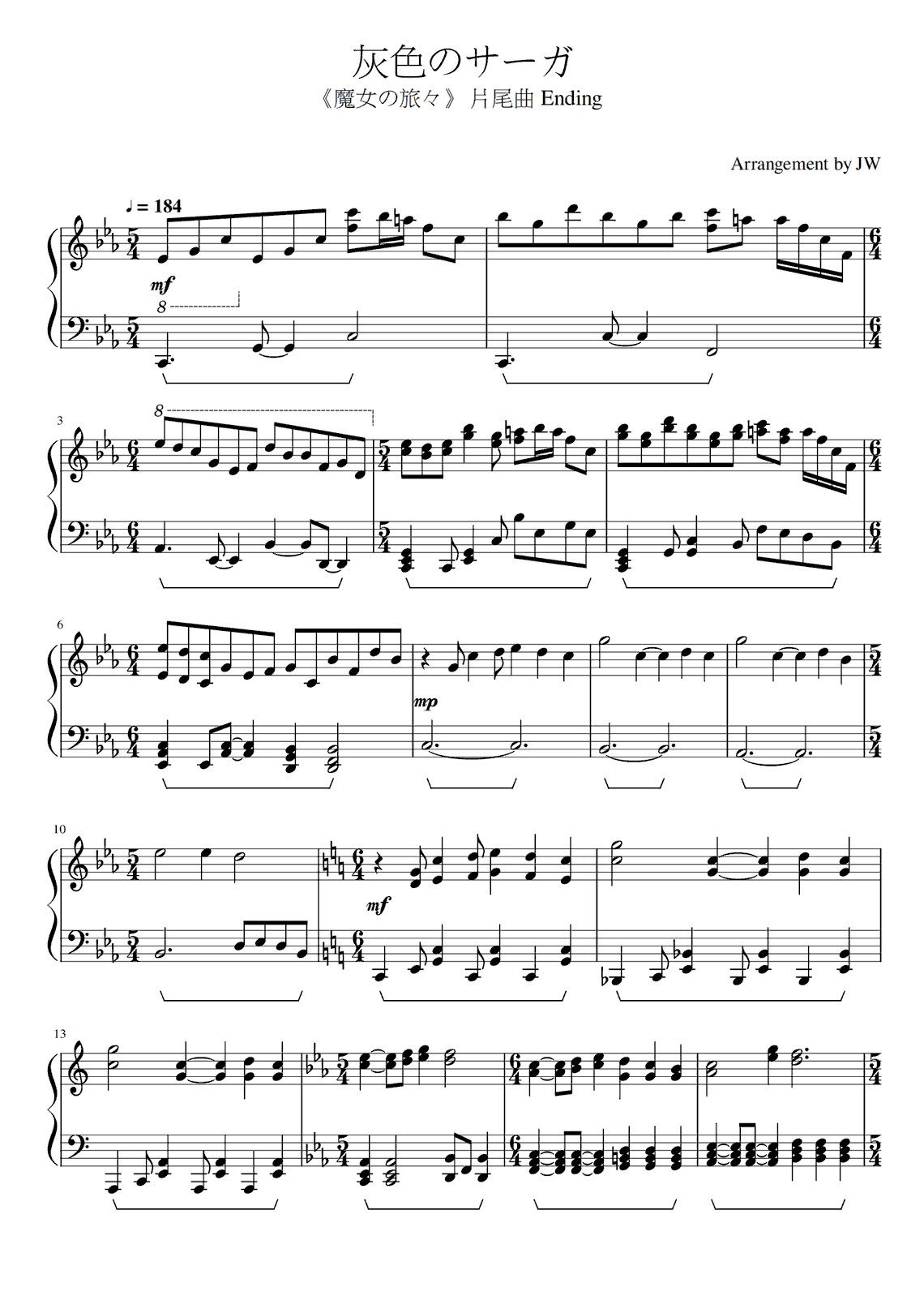 魔女之旅ED《灰色のサーガ》钢琴谱...