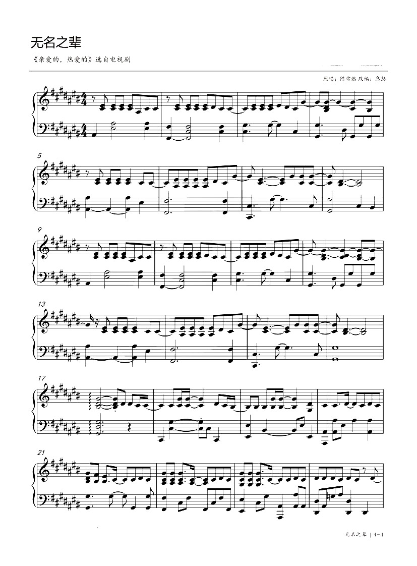 无名之辈》是电视剧《亲爱的,热爱的》主题曲,由唐汉霄作词、作曲,陈雪燃演唱。下面是小编整理的关于《无名之辈》的钢琴谱,欢迎大家阅读。...