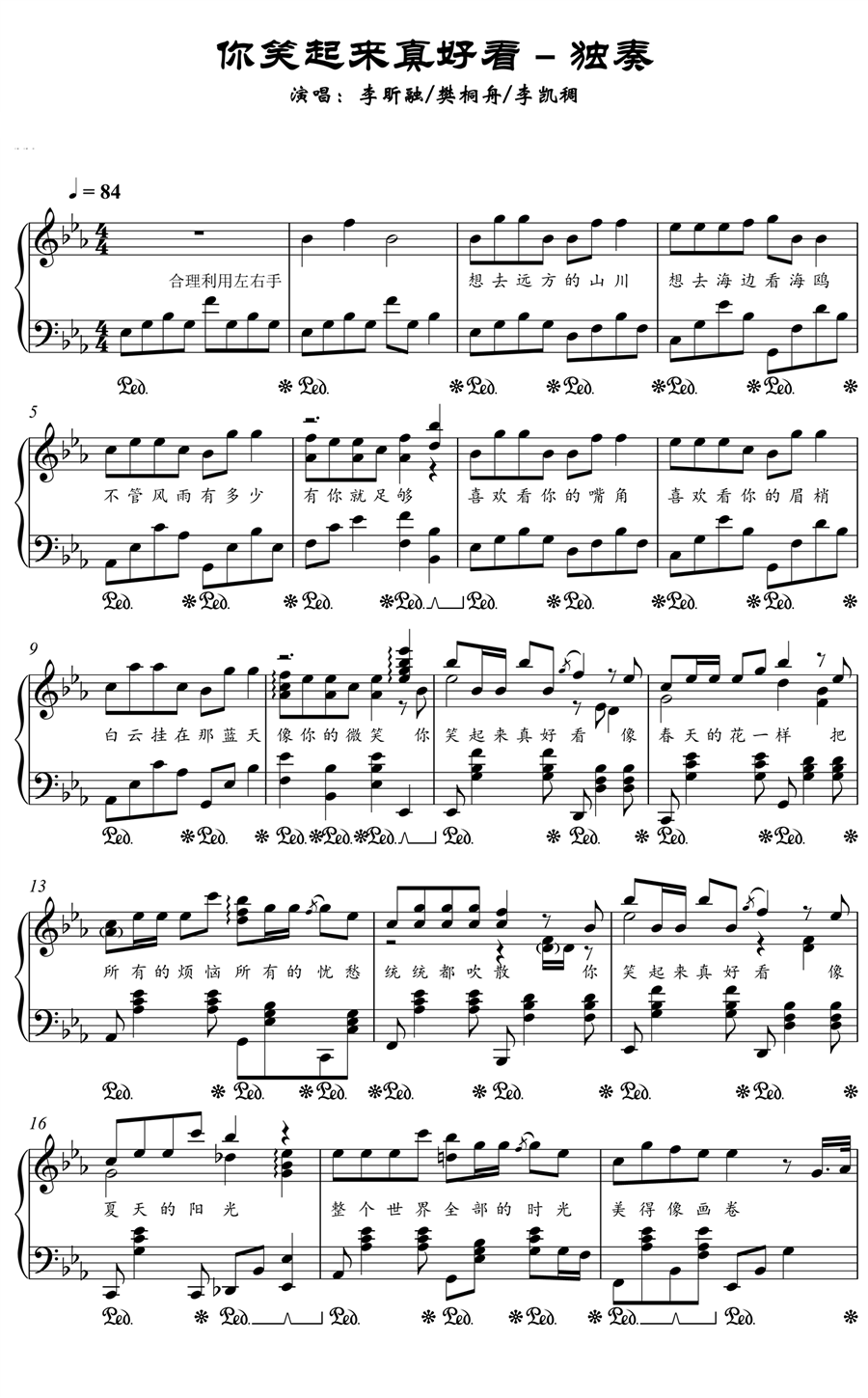 钢琴《你笑起来真好看》独奏版钢琴谱