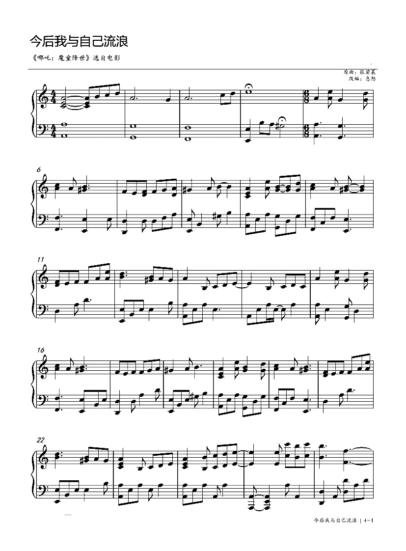 钢琴《哪吒之魔童降世》的片尾曲 张碧晨演唱歌曲《今后我与自己流浪》钢琴谱