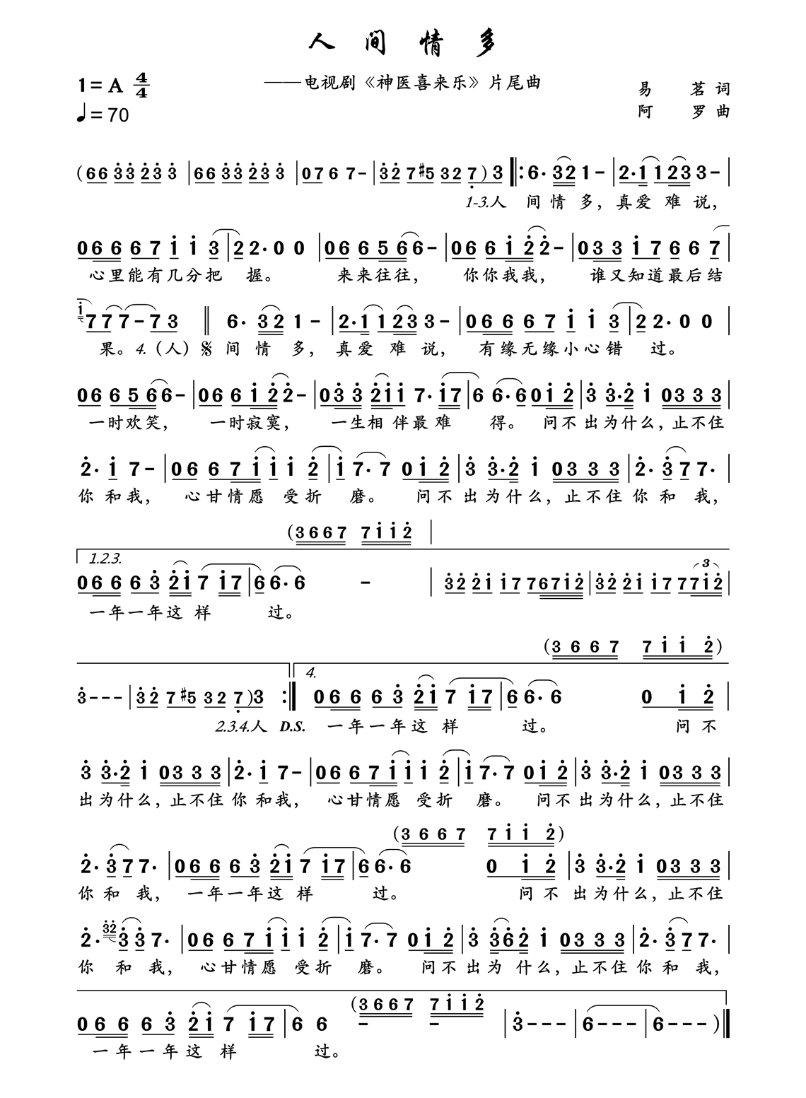 神医喜来乐片尾曲《人间情多》简谱...