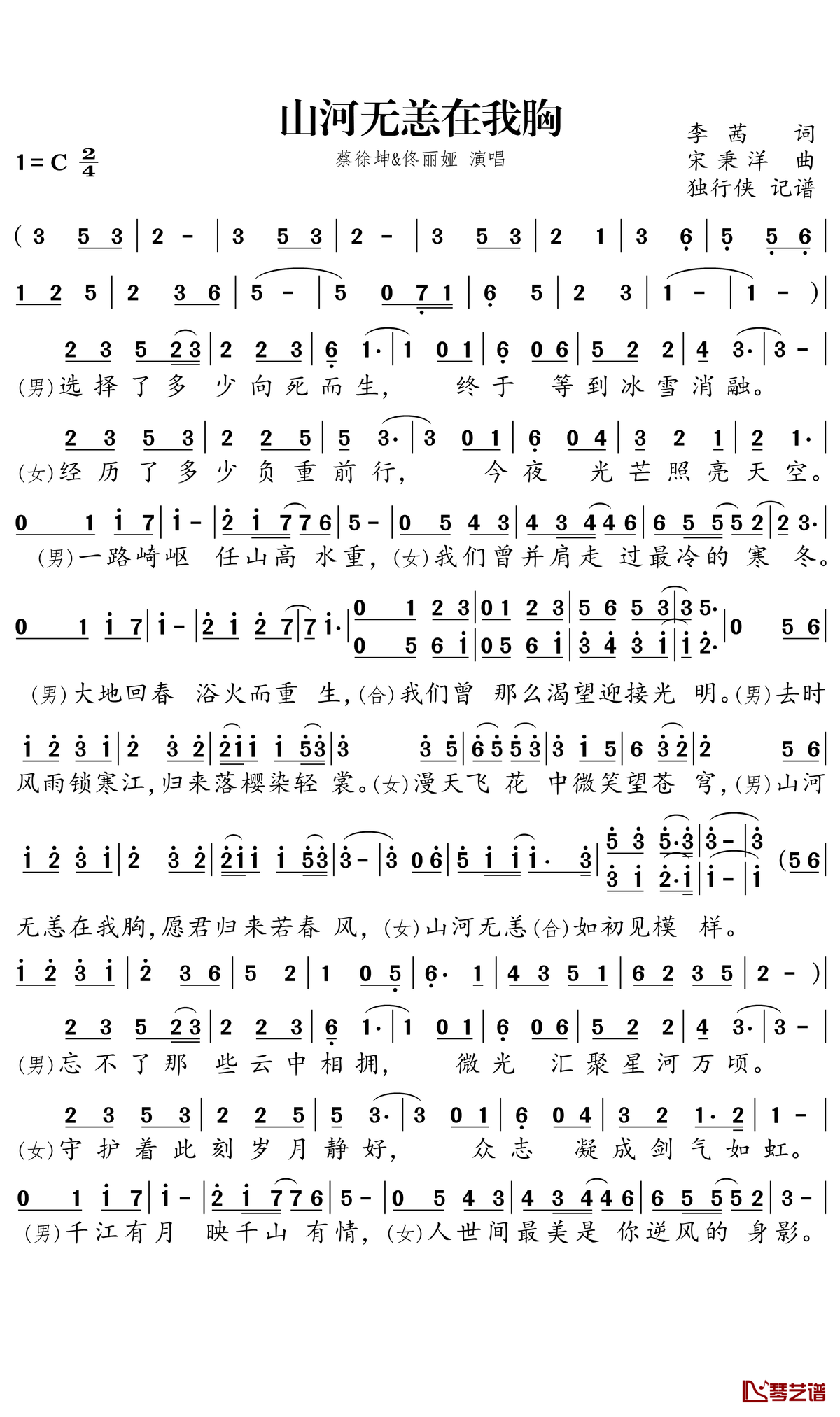蔡徐坤/佟丽娅《山河无恙在我胸》简谱...