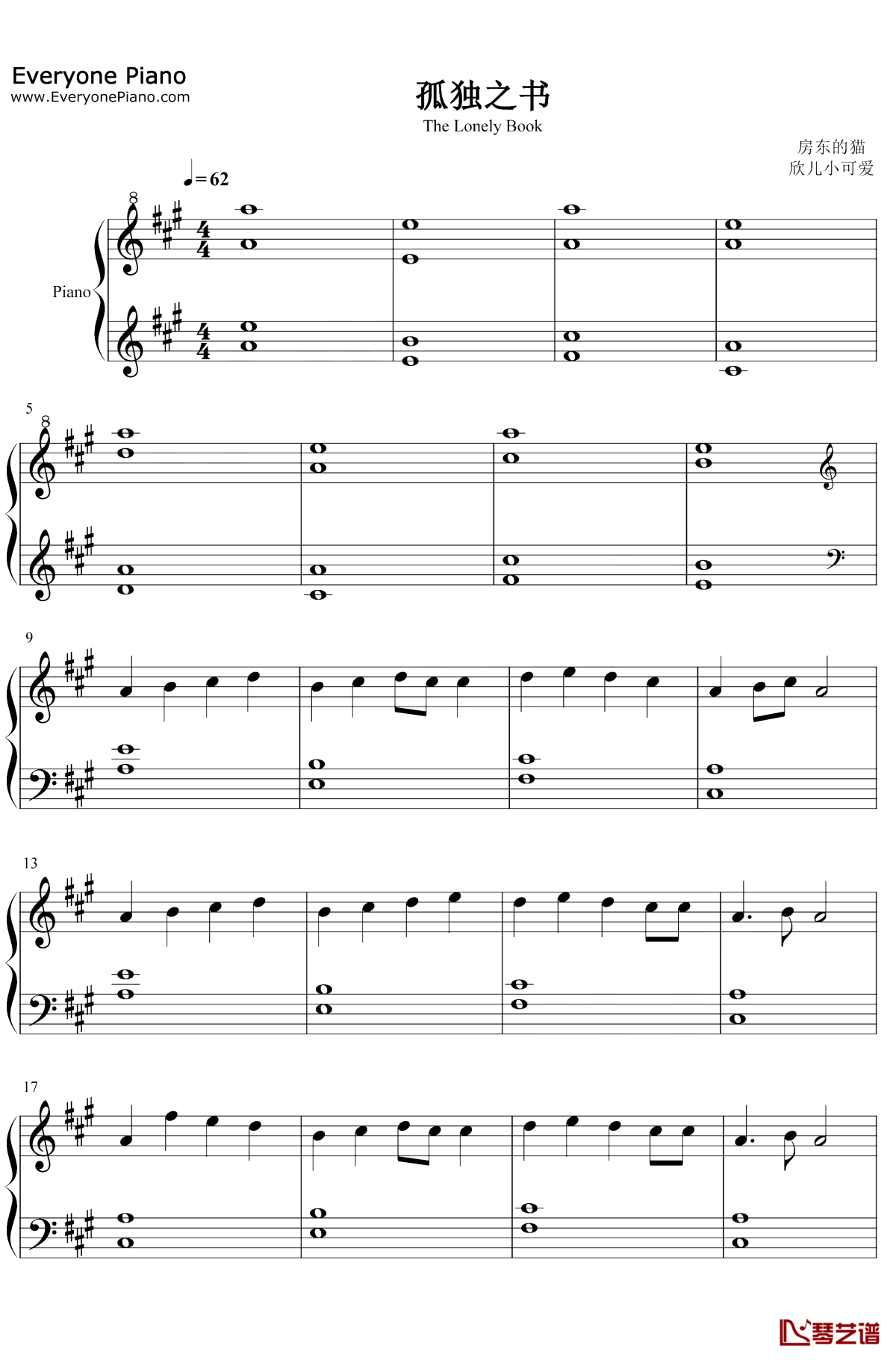 房东的猫《孤独之书》钢琴谱...