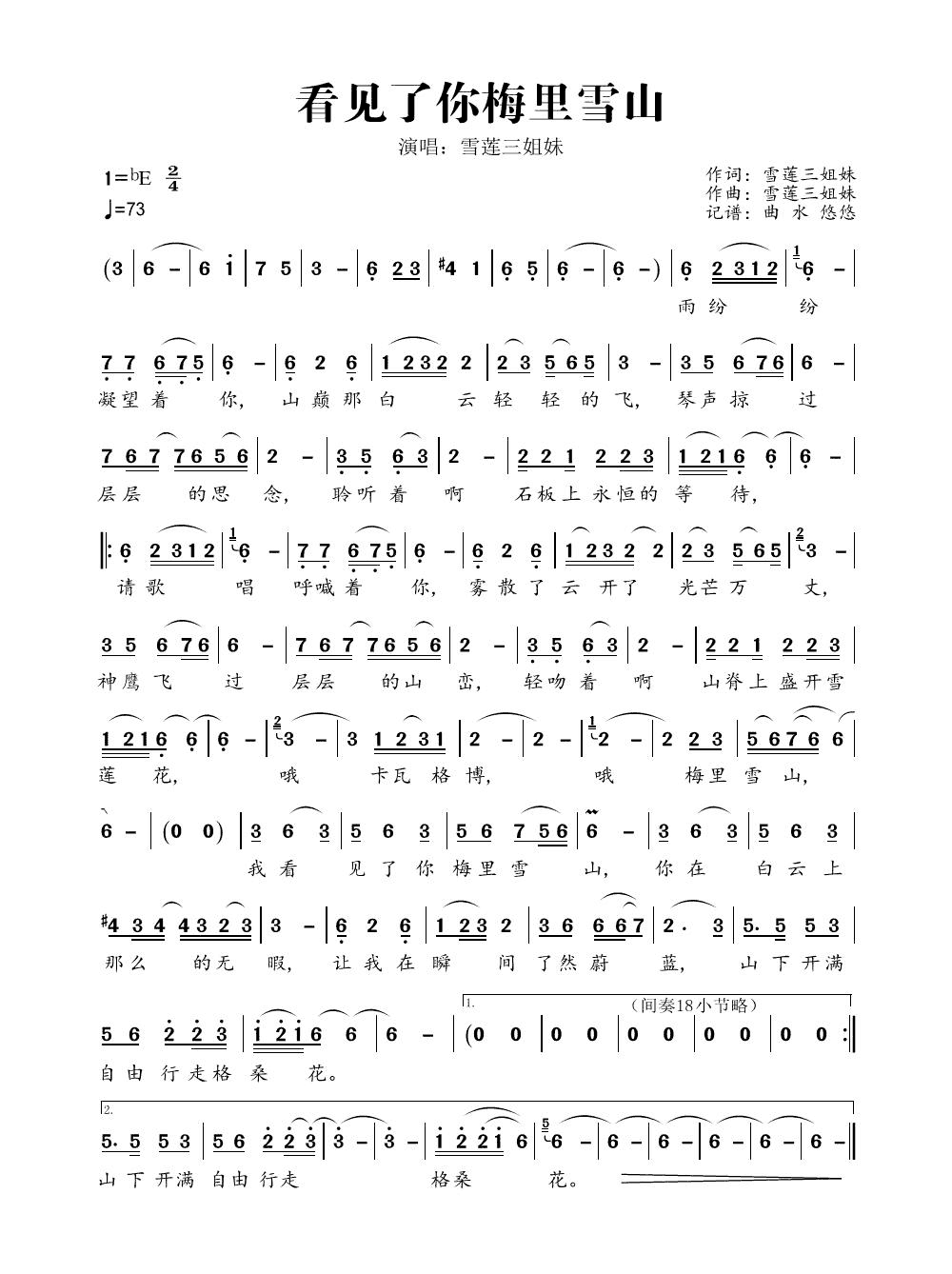 雪莲三姐妹《看见了你梅里雪山》简谱...