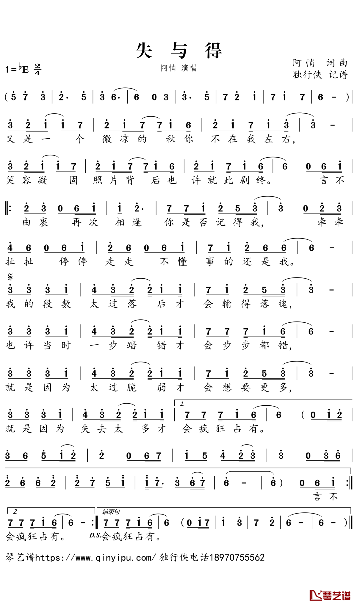 阿悄《失与得》简谱...