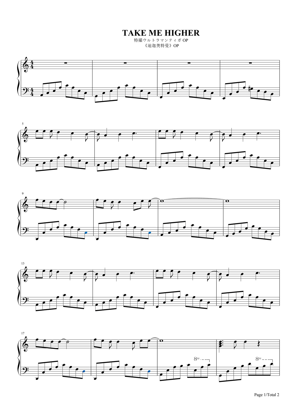 迪迦奥特曼主题曲《TakeMeHigher》钢琴谱...