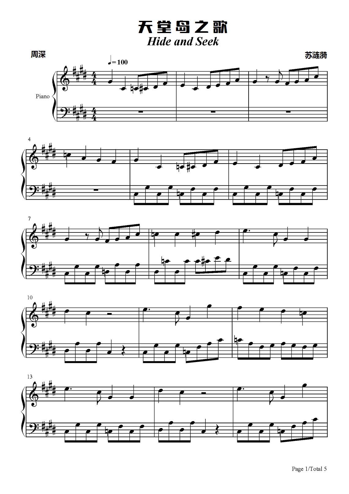 周深《天堂岛之歌》钢琴谱...