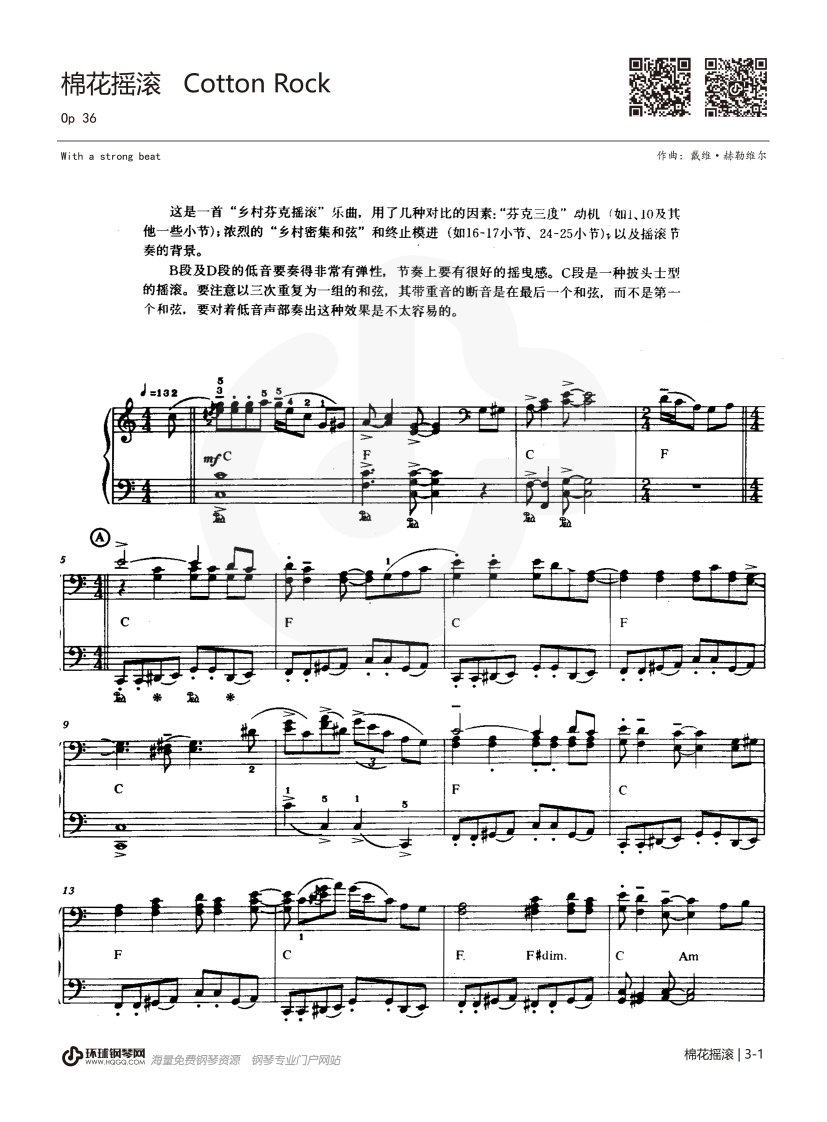钢琴戴维·赫乐韦尔《棉花摇滚》钢琴谱