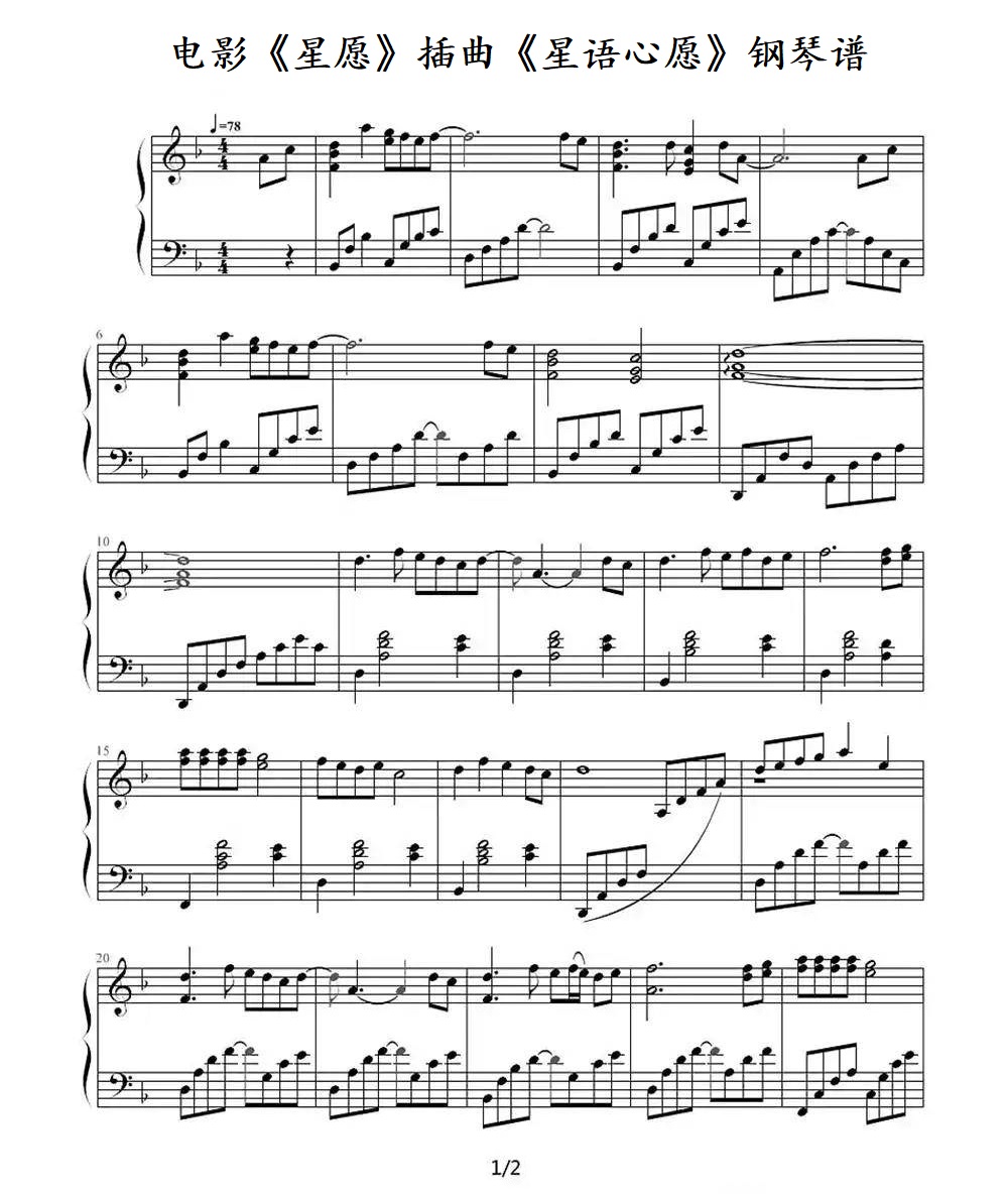 电影《星愿》插曲《星语心愿》钢琴谱...
