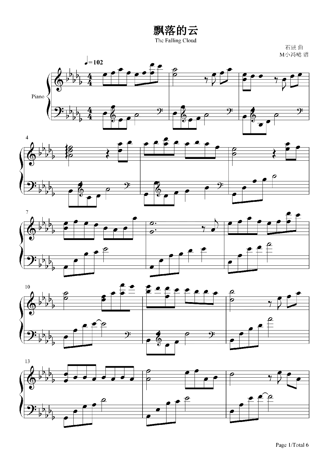 钢琴石进《飘落的云》钢琴谱