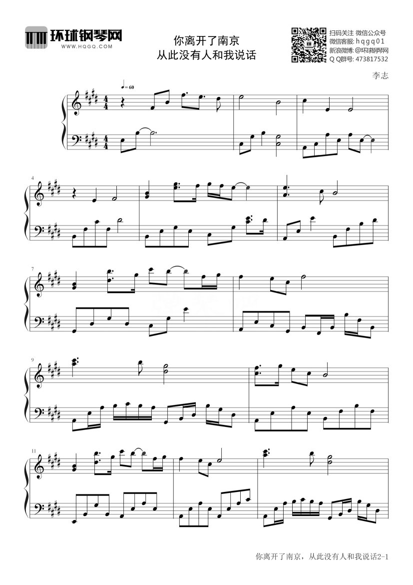 钢琴李志《你离开了南京,从此没有人和我说话》钢琴谱
