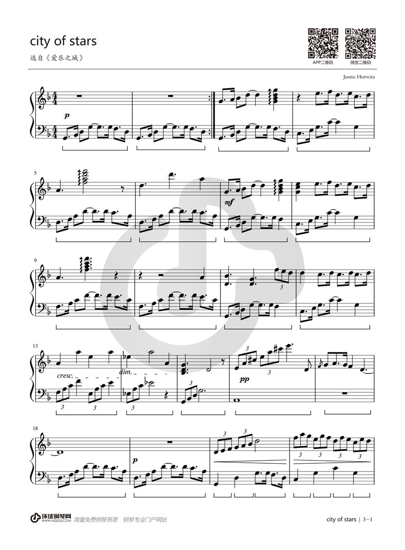 钢琴《City of Stars》钢琴谱(电影《爱乐之城》主题曲)