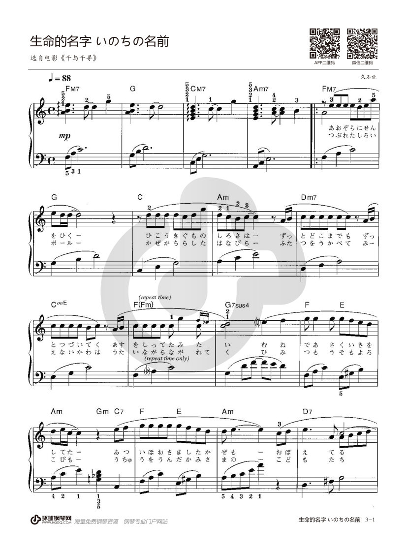 钢琴久石让《生命的名字》钢琴谱