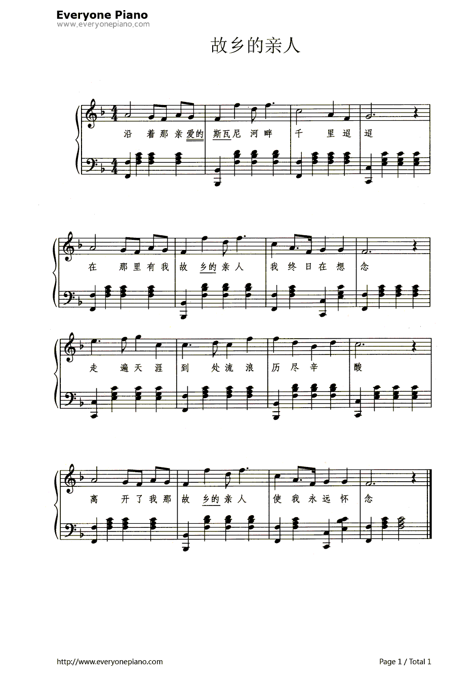 福斯特《故乡的亲人》(简易带歌词版)弹唱钢琴谱...