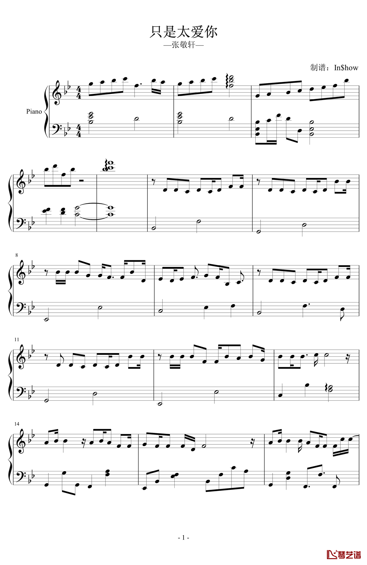 钢琴张敬轩《只是太爱你》钢琴谱