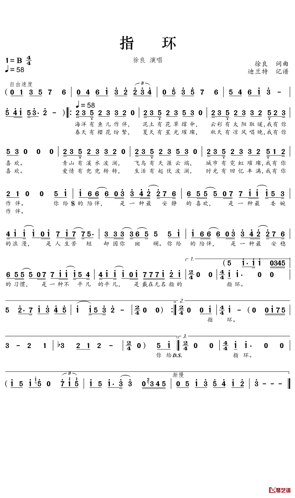 徐良《指环》简谱...