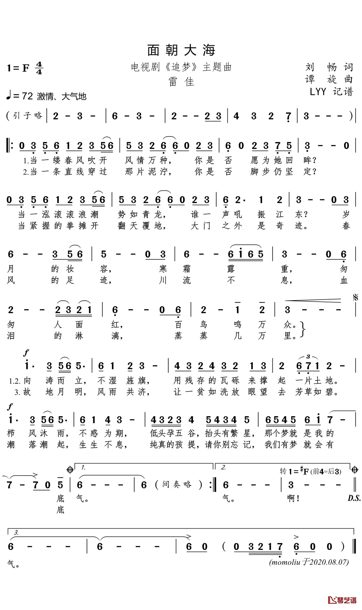 雷佳《面朝大海》简谱...