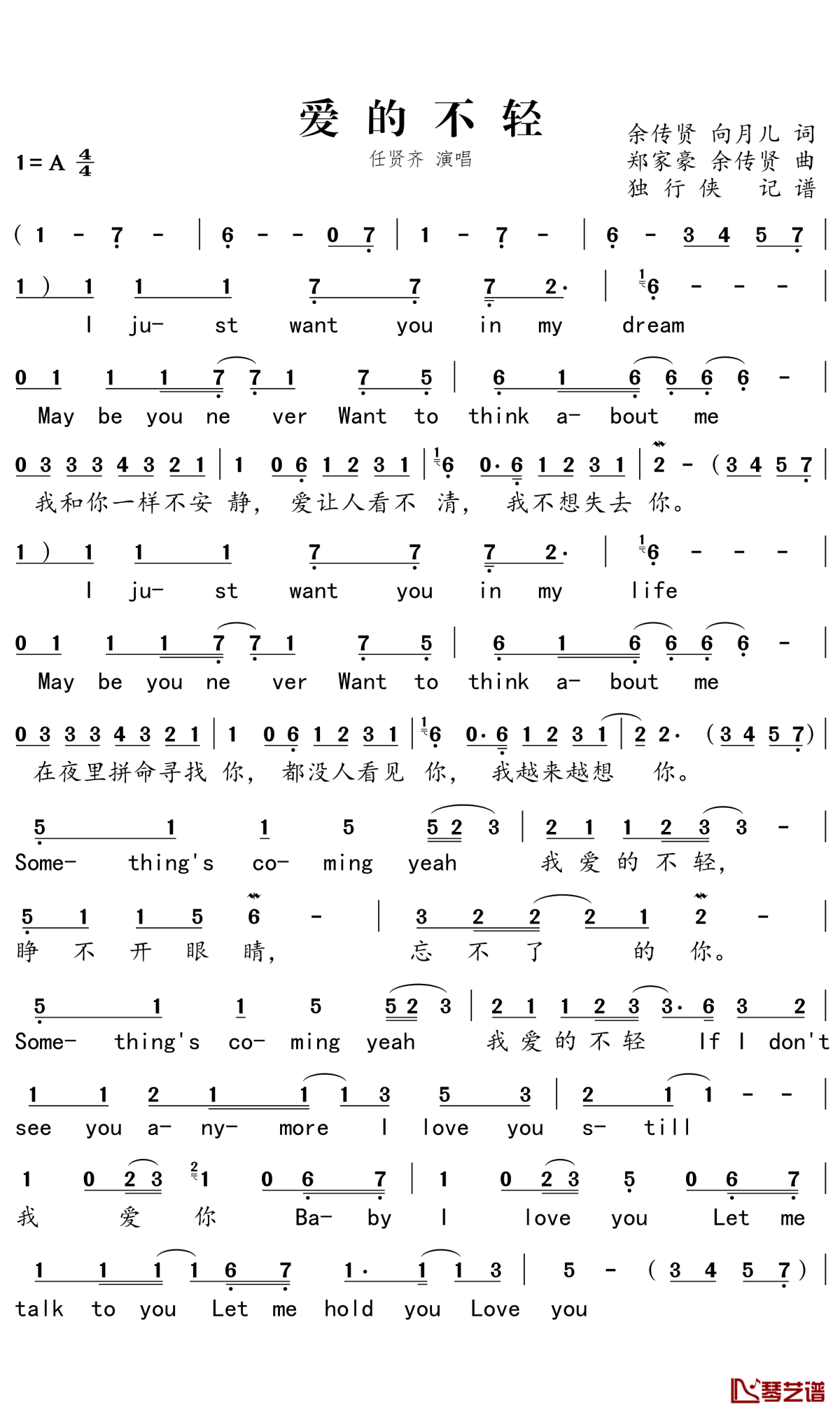 钢琴任贤齐《爱的不轻》简谱