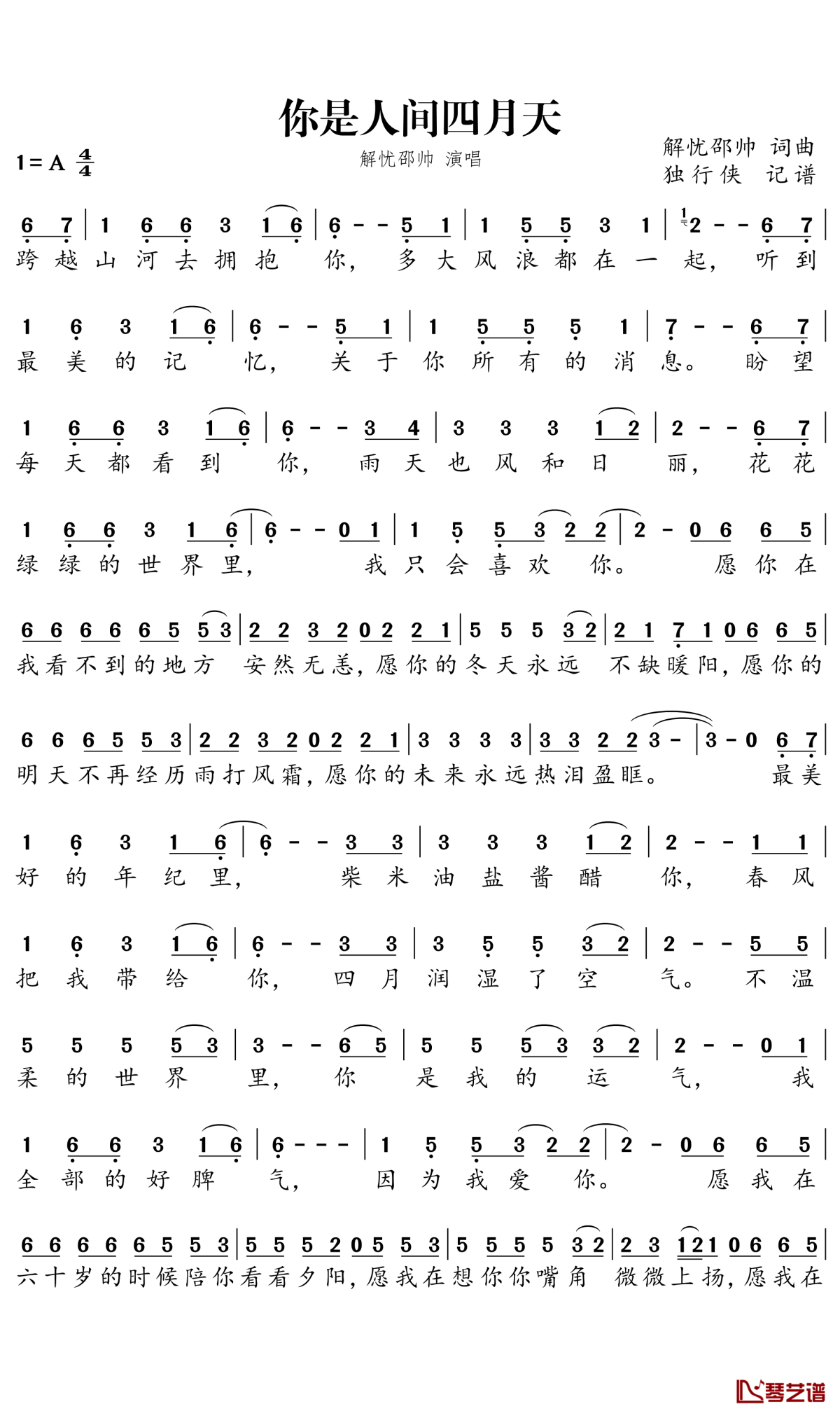 解忧邵帅《你是人间四月天》简谱歌曲...
