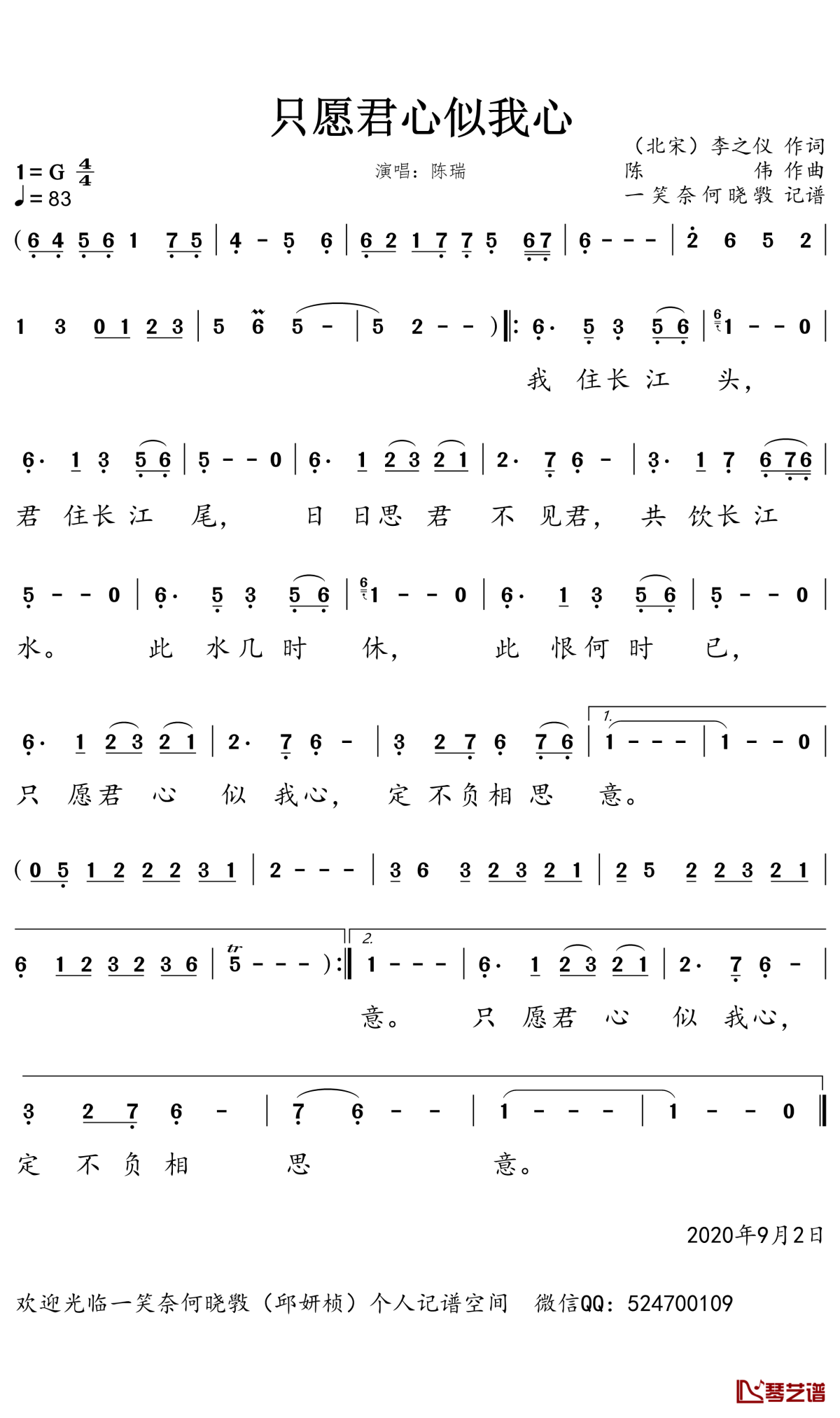 陈瑞《只愿君心似我心》简谱歌曲...