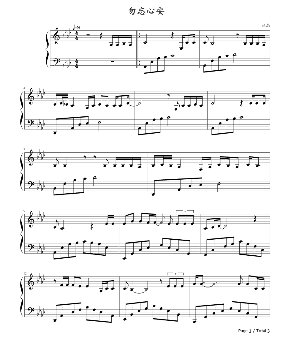 张杰《勿忘心安》钢琴谱...