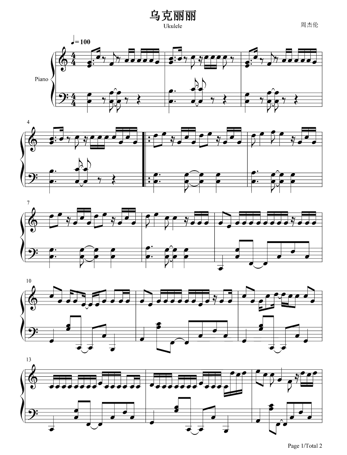 钢琴周杰伦《乌克丽丽》钢琴谱