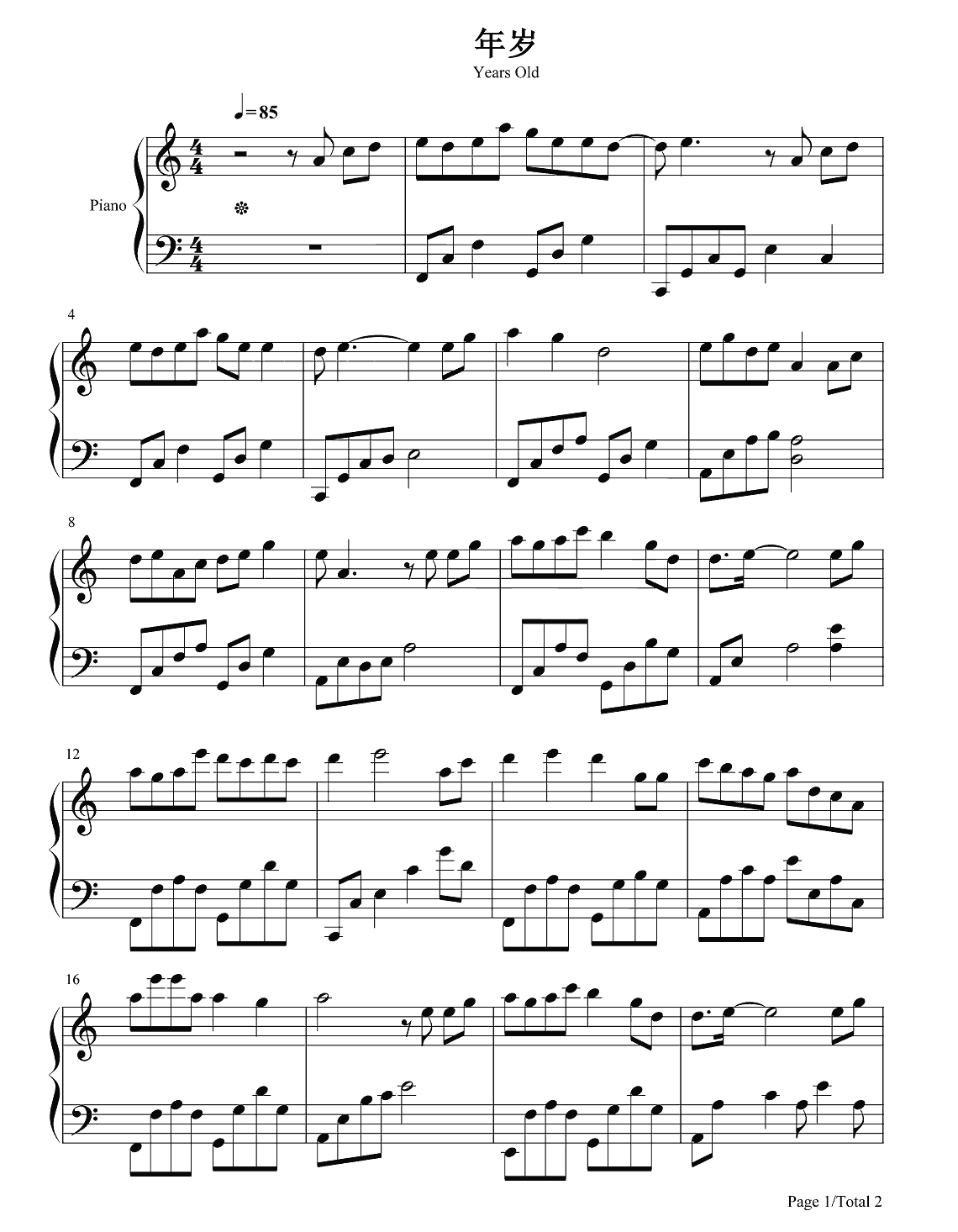 钢琴毛不易《年岁》钢琴谱