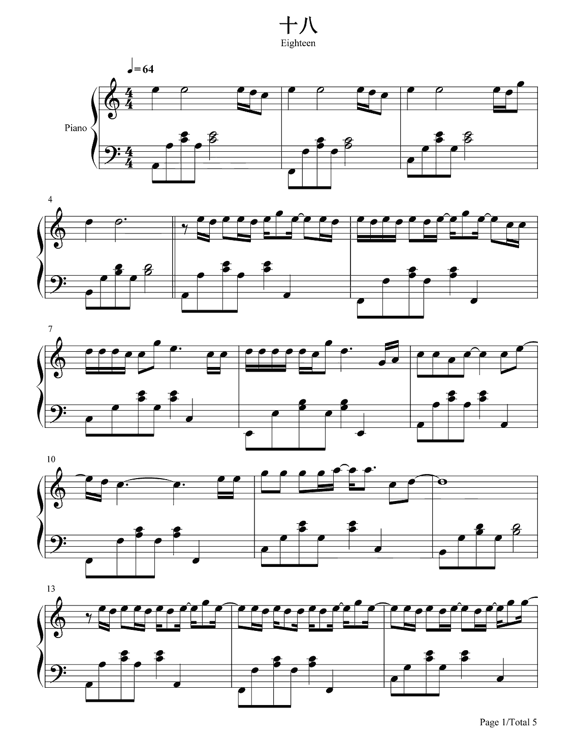 钢琴陈雪凝《十八》钢琴谱