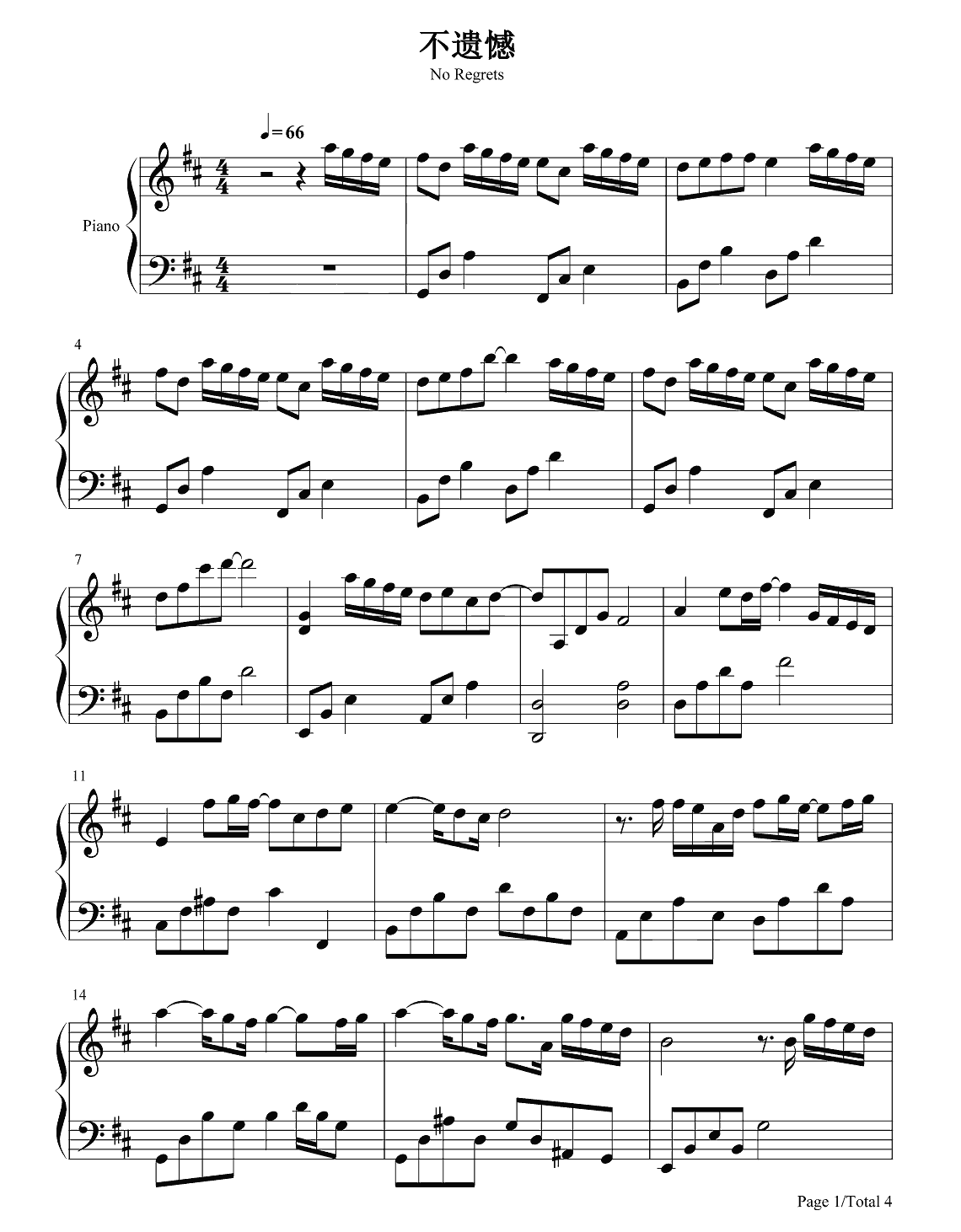 钢琴李荣浩《不遗憾》钢琴谱