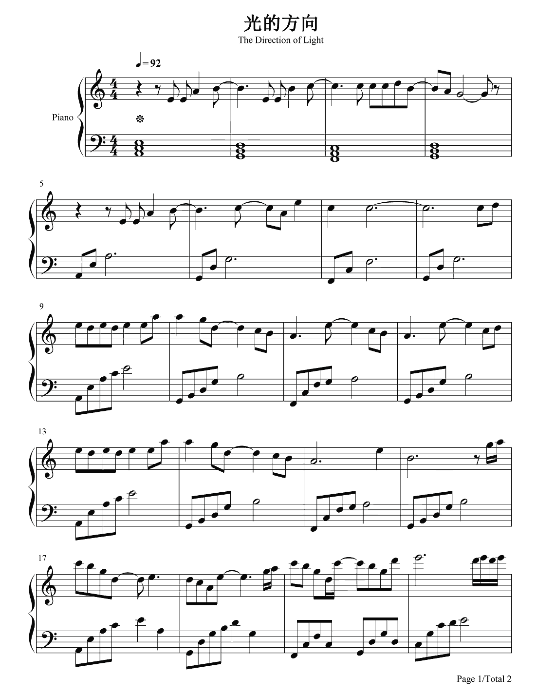 钢琴张碧晨《光的方向》钢琴谱