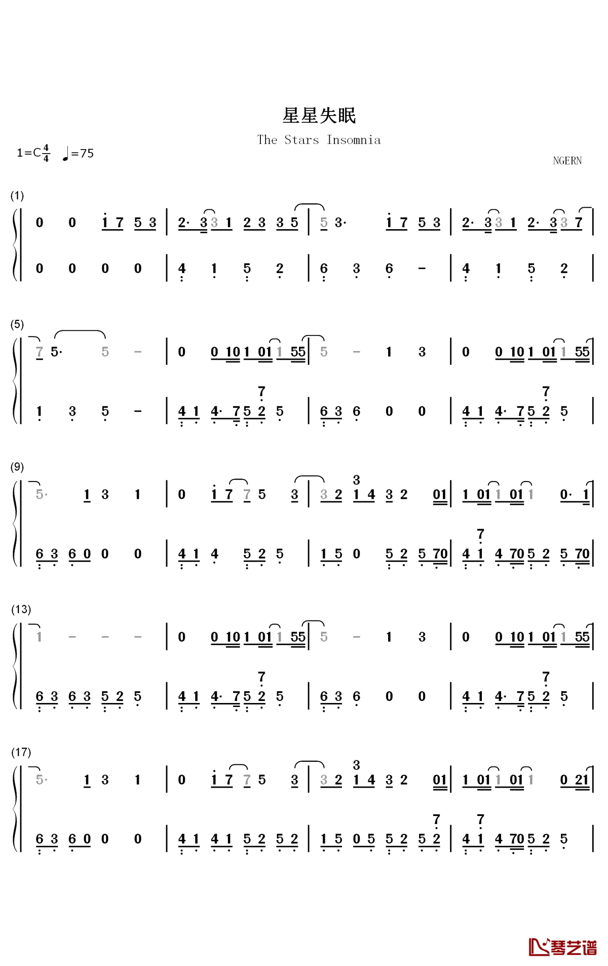 《星星失眠》钢琴简谱-数字双手...