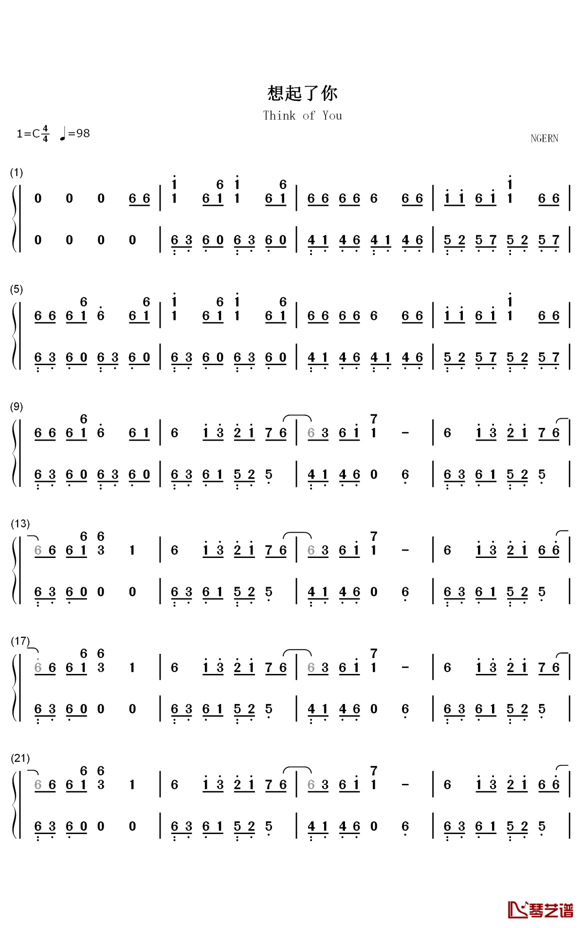 钢琴《想起了你》钢琴简谱-数字双手