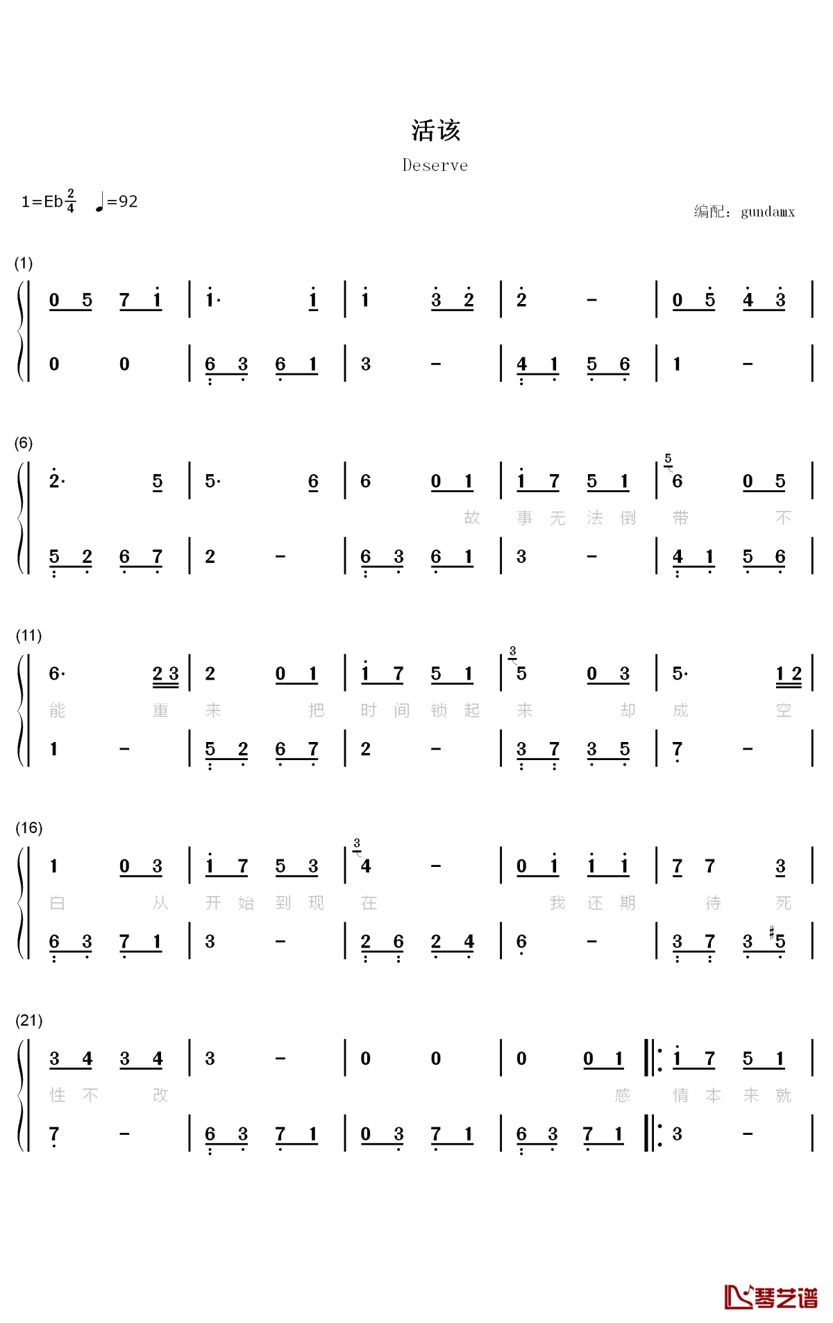 《活该》钢琴简谱-数字双手...