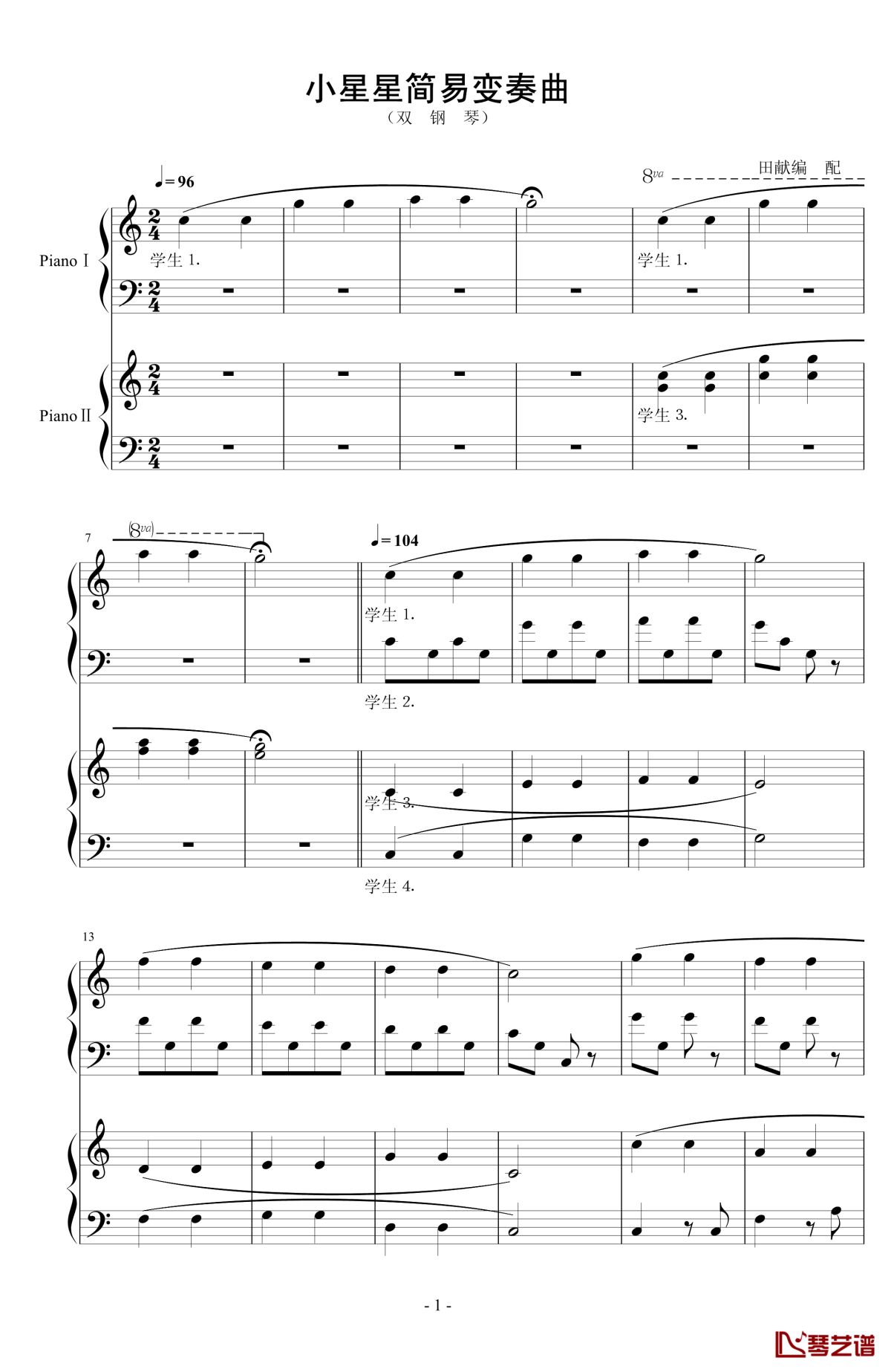 钢琴莫扎特《小星星简易变奏曲》钢琴谱-双钢琴