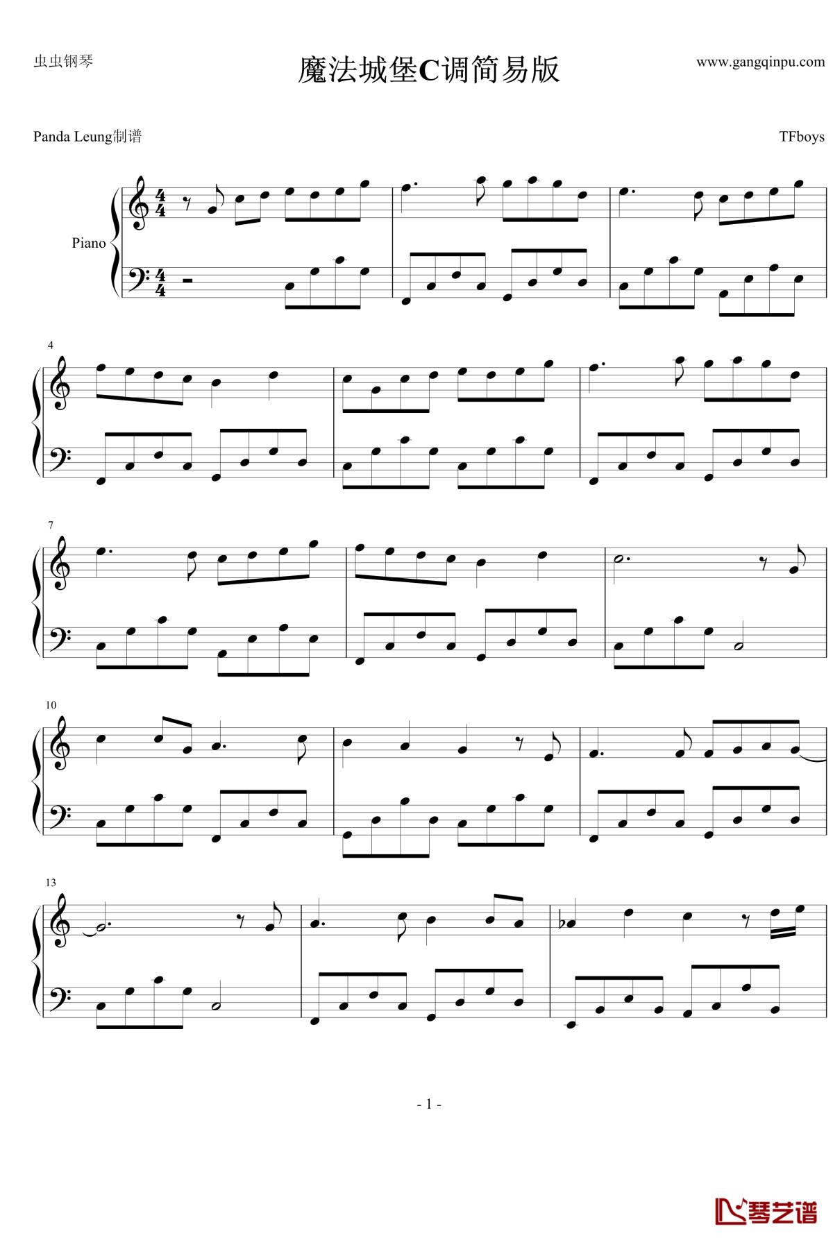 钢琴TFboys《魔法城堡》钢琴谱-C调简易版