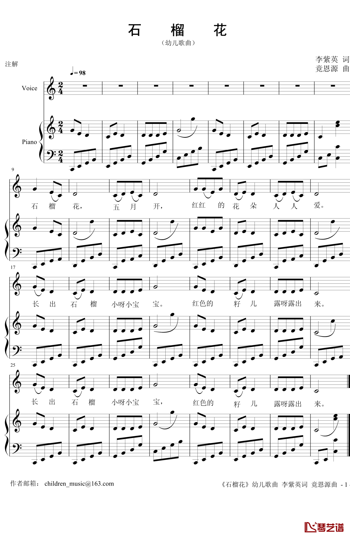 竟恩源《石榴花》钢琴谱-幼儿歌曲...