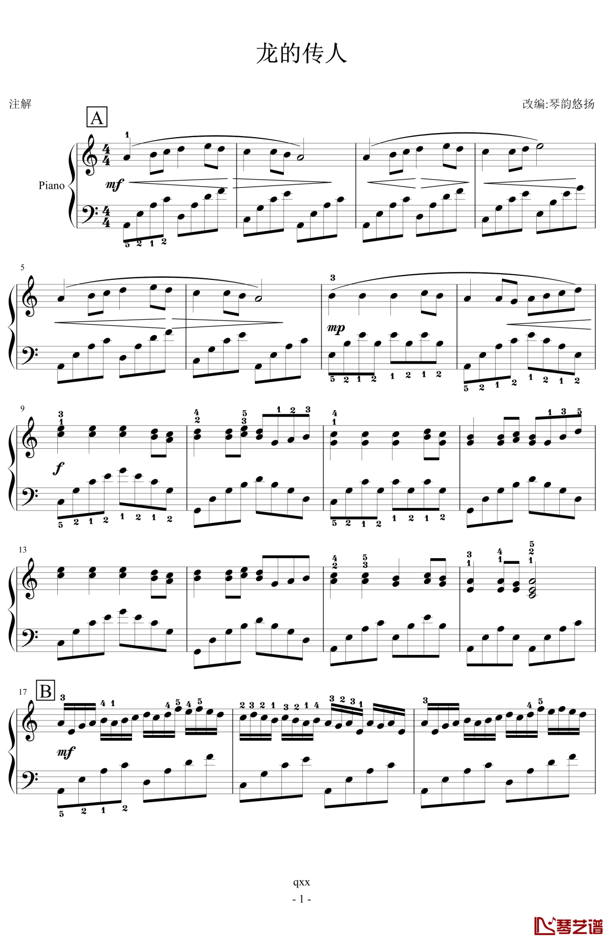 张明敏《龙的传人》钢琴谱-指法简易版...