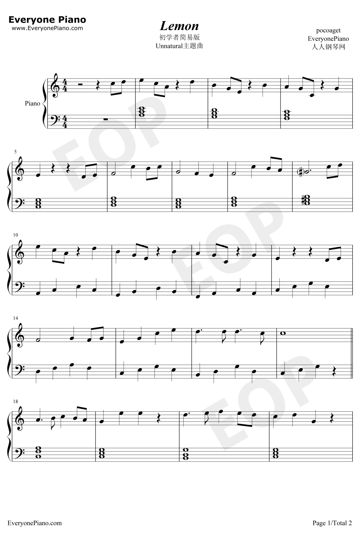 钢琴米津玄师《Lemon》钢琴谱--初学者C调简易版