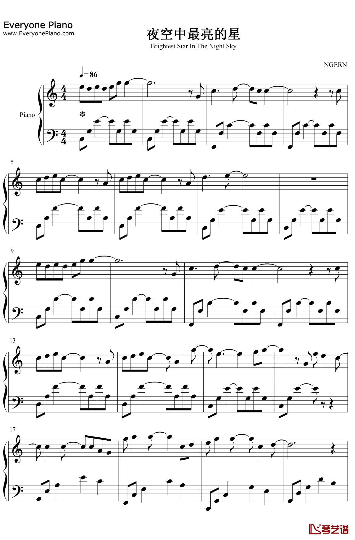 钢琴逃跑计划《夜空中最亮的星》钢琴谱--C调简单版