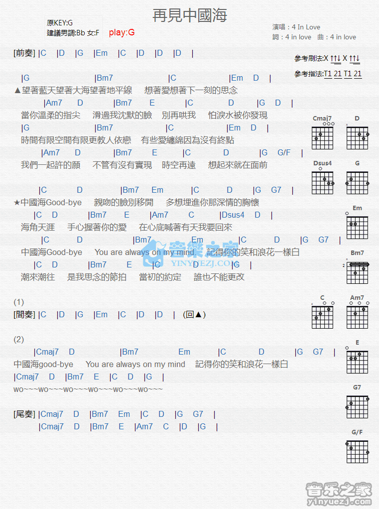 G调版4InLove《再见中国海》吉他和弦弹唱谱...