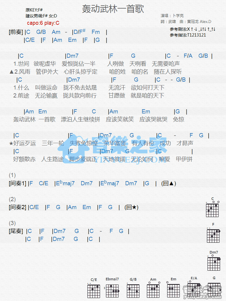 C调版卜学亮《轰动武林一首歌》吉他和弦弹唱谱...