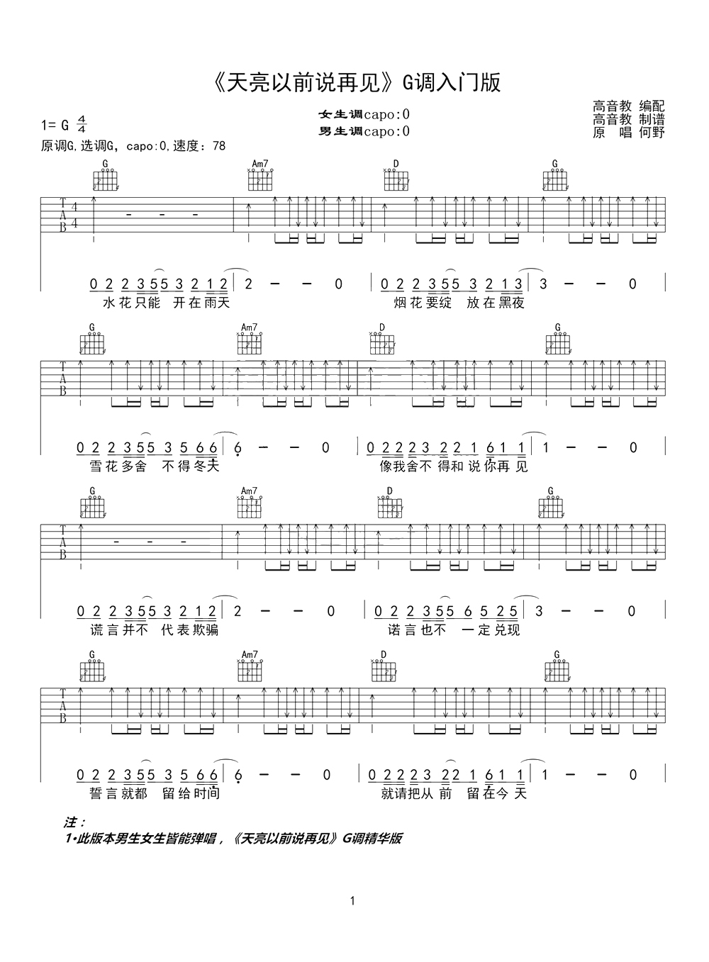 吉他何野《天亮以前说再见》吉他谱_吉他弹唱谱_高音教编配