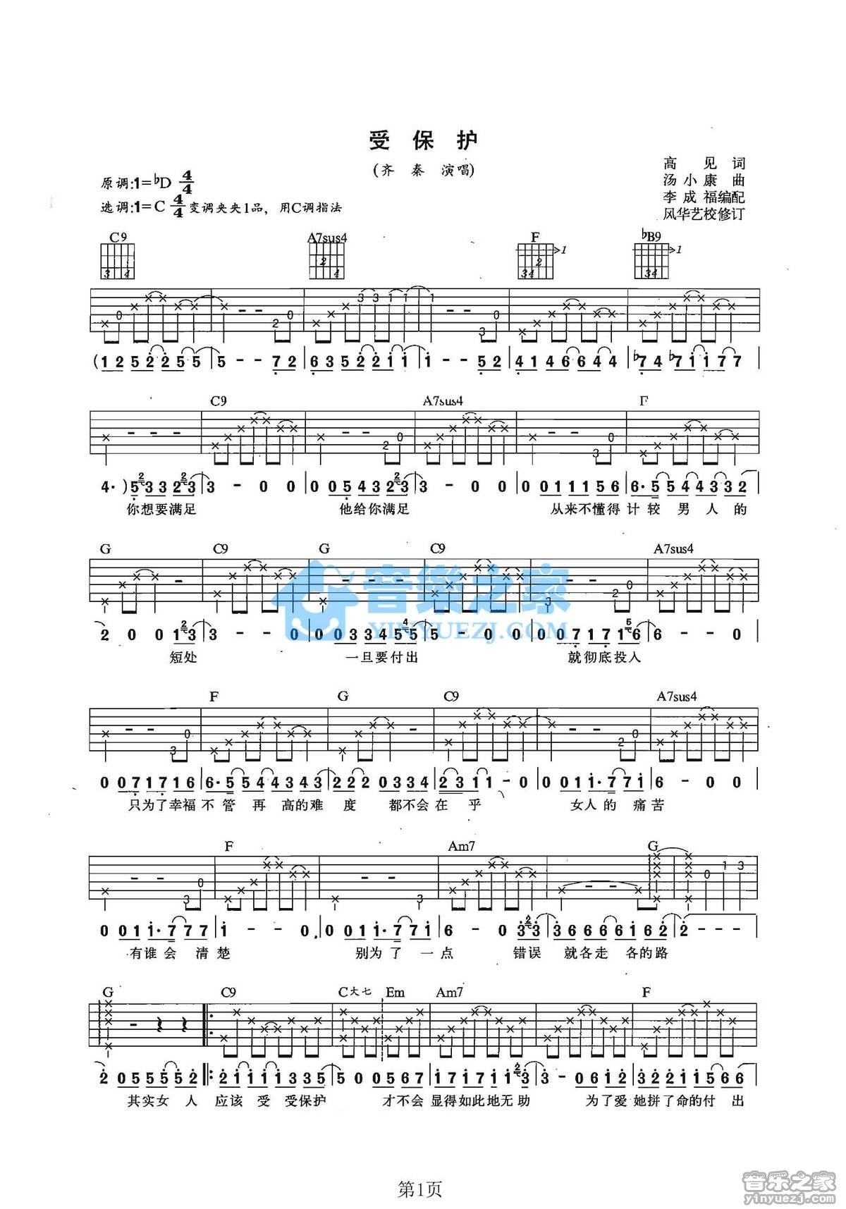 C调版齐秦《受保护》吉他弹唱六线谱...