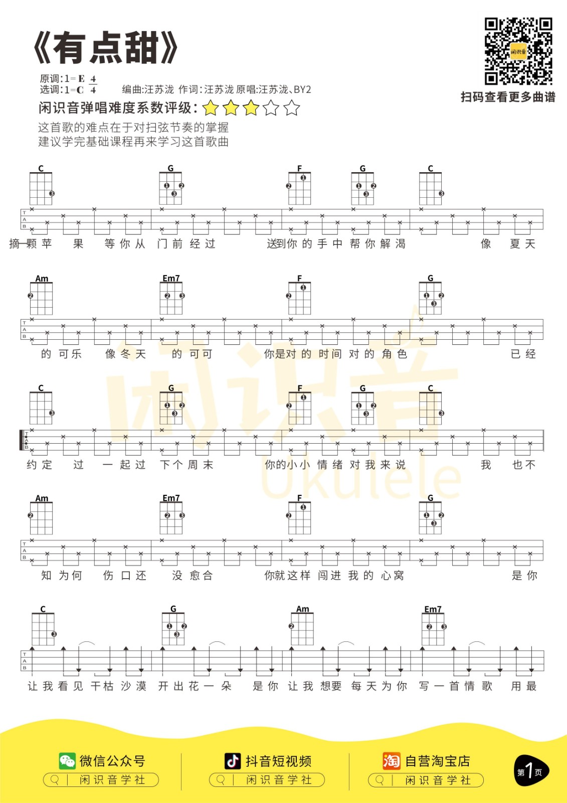 汪苏泷、BY2《有点甜》尤克里里曲谱-C调弹唱谱...