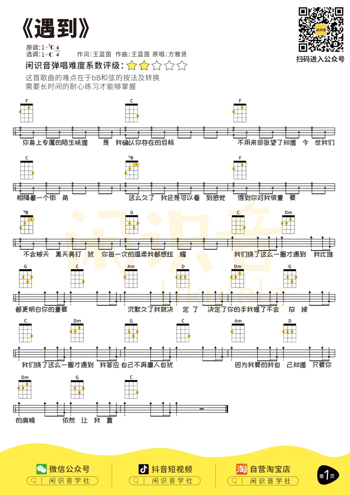 尤克里里方雅贤《遇到》尤克里里曲谱-C调弹唱谱