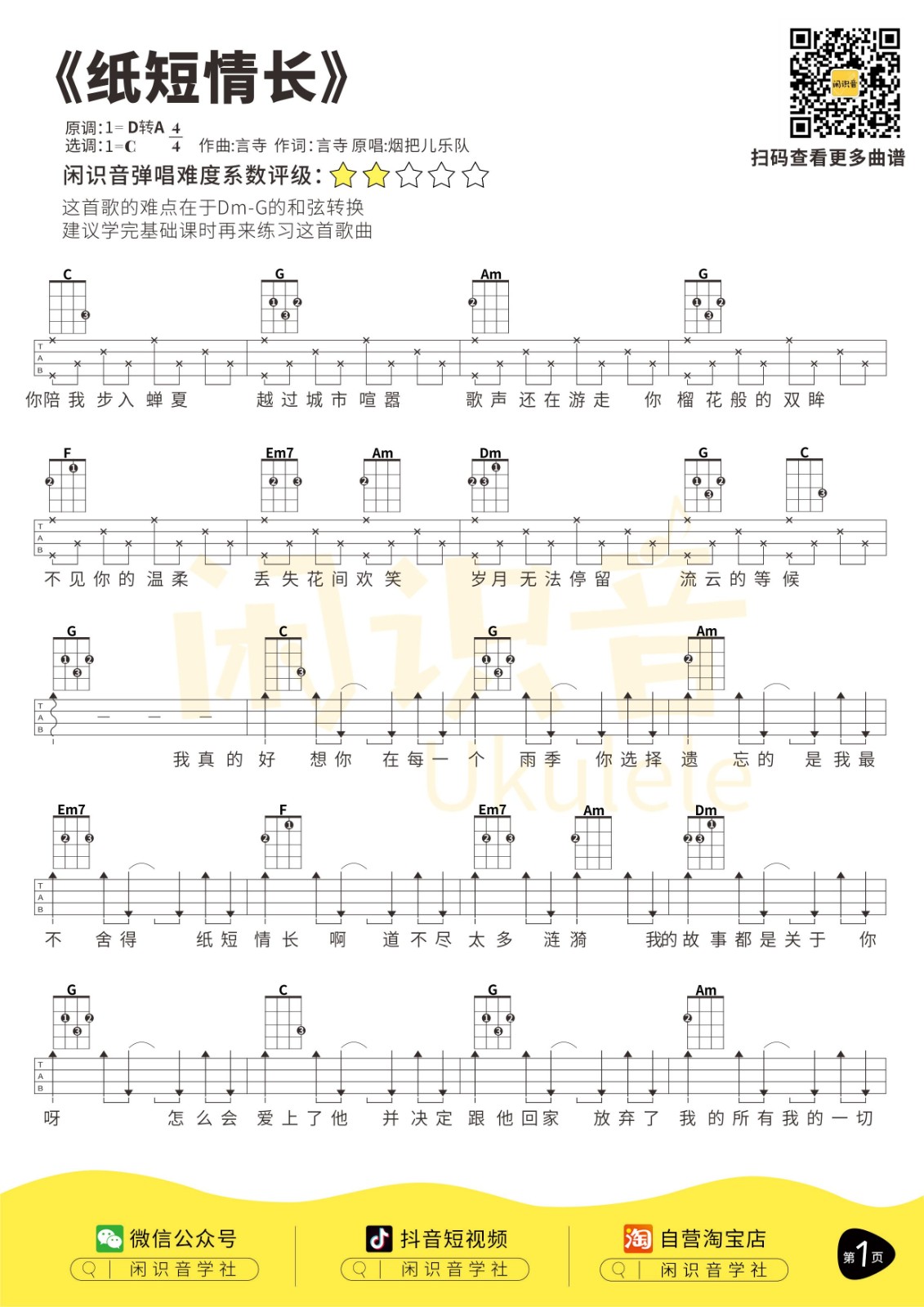 烟把儿乐队《纸短情长》尤克里里曲谱-C调弹唱谱...