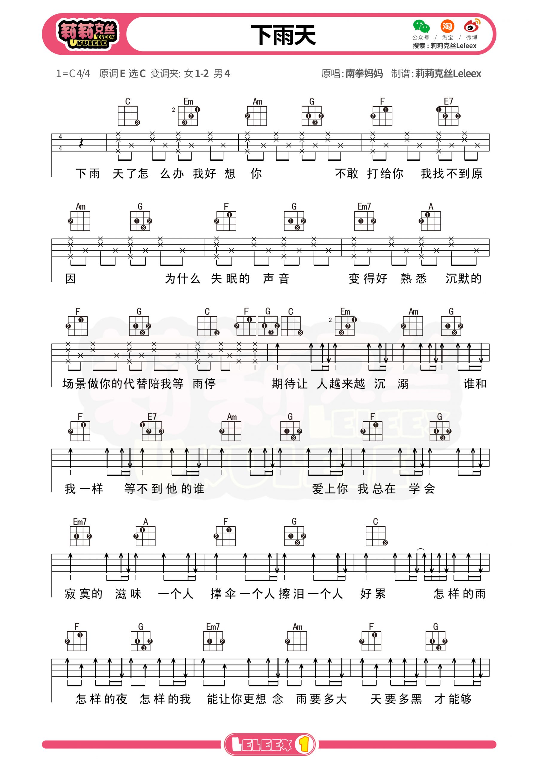 《下雨天》尤克里里弹唱谱-南拳妈妈-C调弹唱谱...