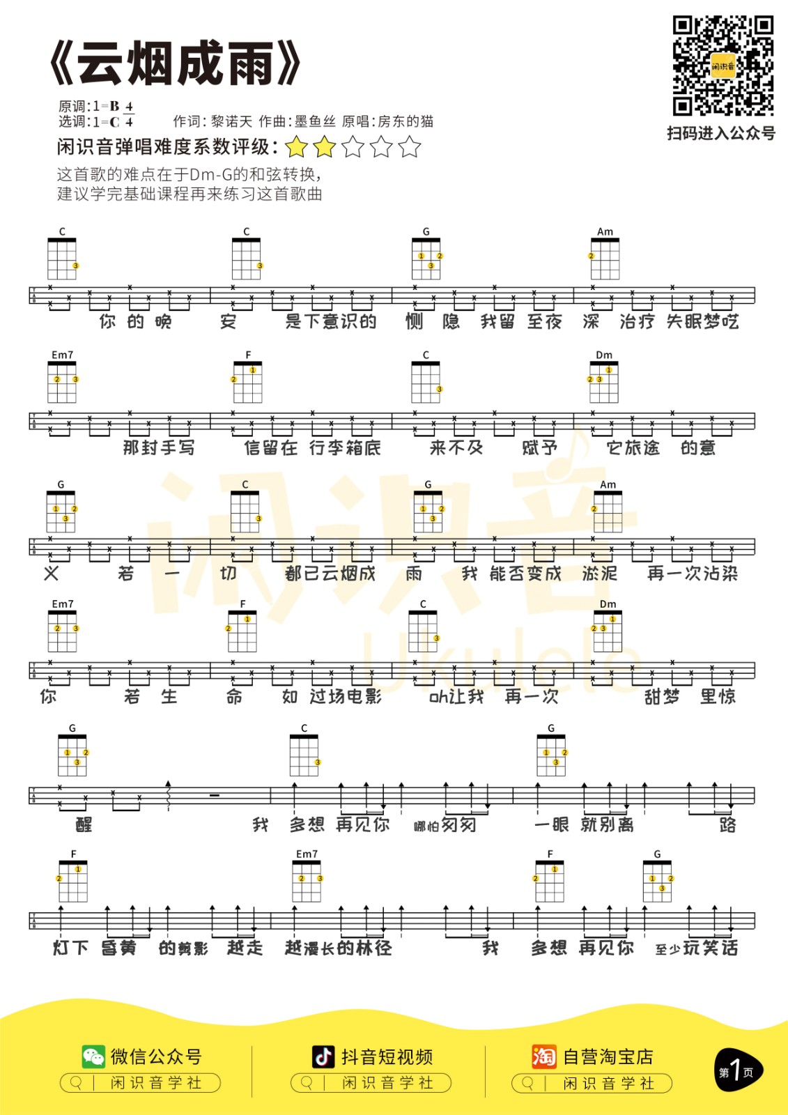 尤克里里房东的猫《云烟成雨》尤克里里曲谱-C调弹唱谱
