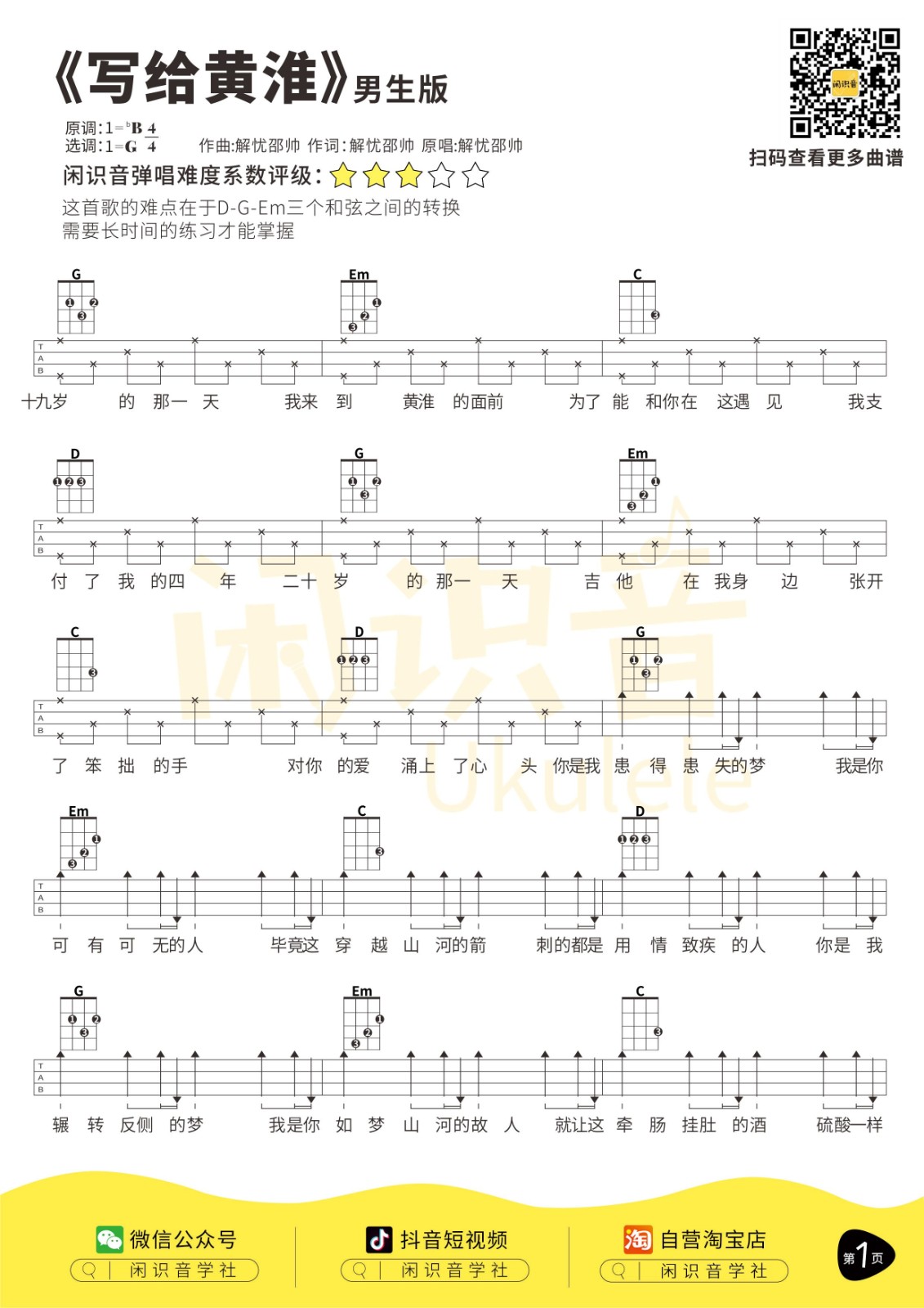解忧邵帅《写给黄淮》男生版/女生版尤克里里曲谱-G调弹唱谱...