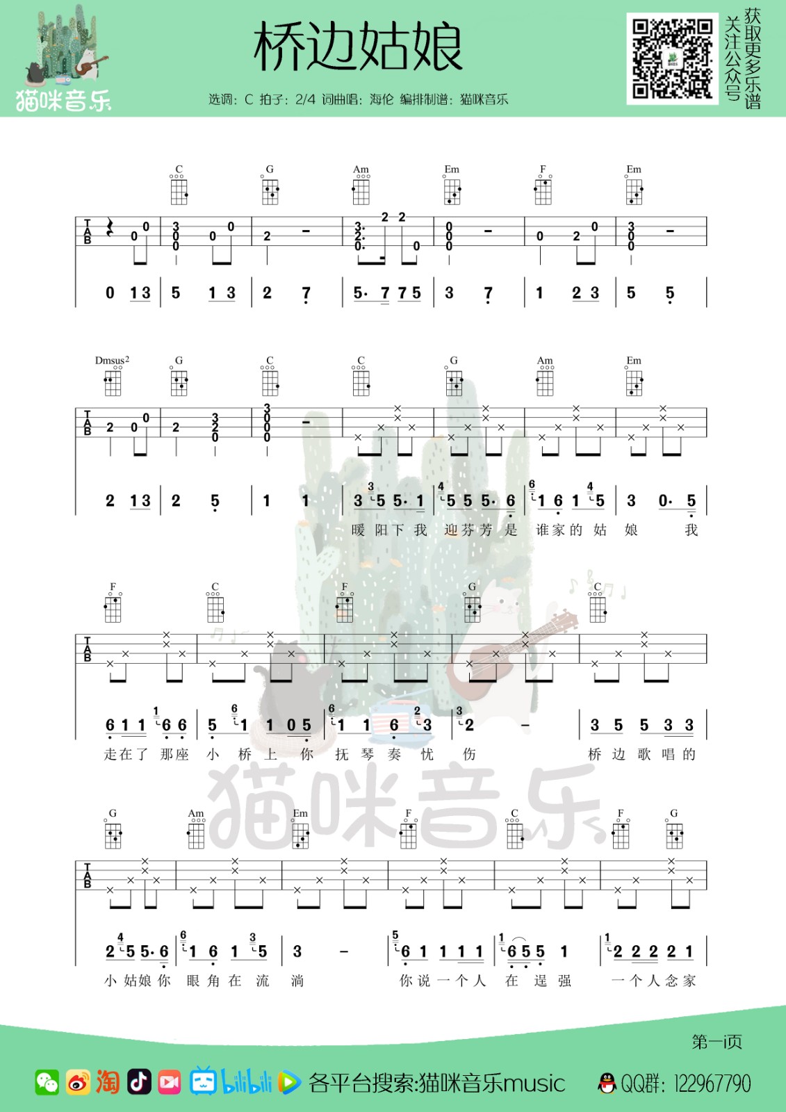 《桥边姑娘》尤克里里弹唱谱-C调弹唱谱...